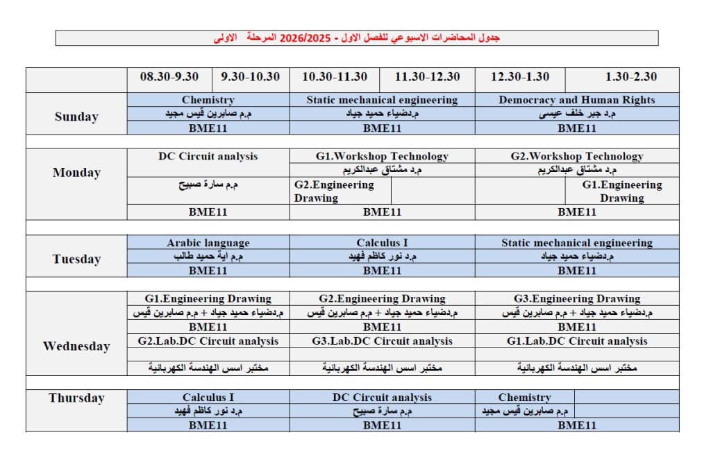 يعلن قسم هندسة الطب الحياتي في كلية الهندسة / جامعة ميسان عن الجدول الأسبوعي للمحاضرات للعام الدراسي 2025/2026.