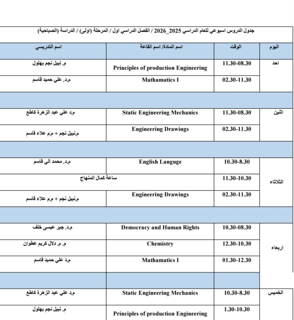 يعلن قسم الهندسة الميكانيكية في كلية الهندسة / جامعة ميسان عن الجدول الأسبوعي للمحاضرات للعام الدراسي 2025/2026.