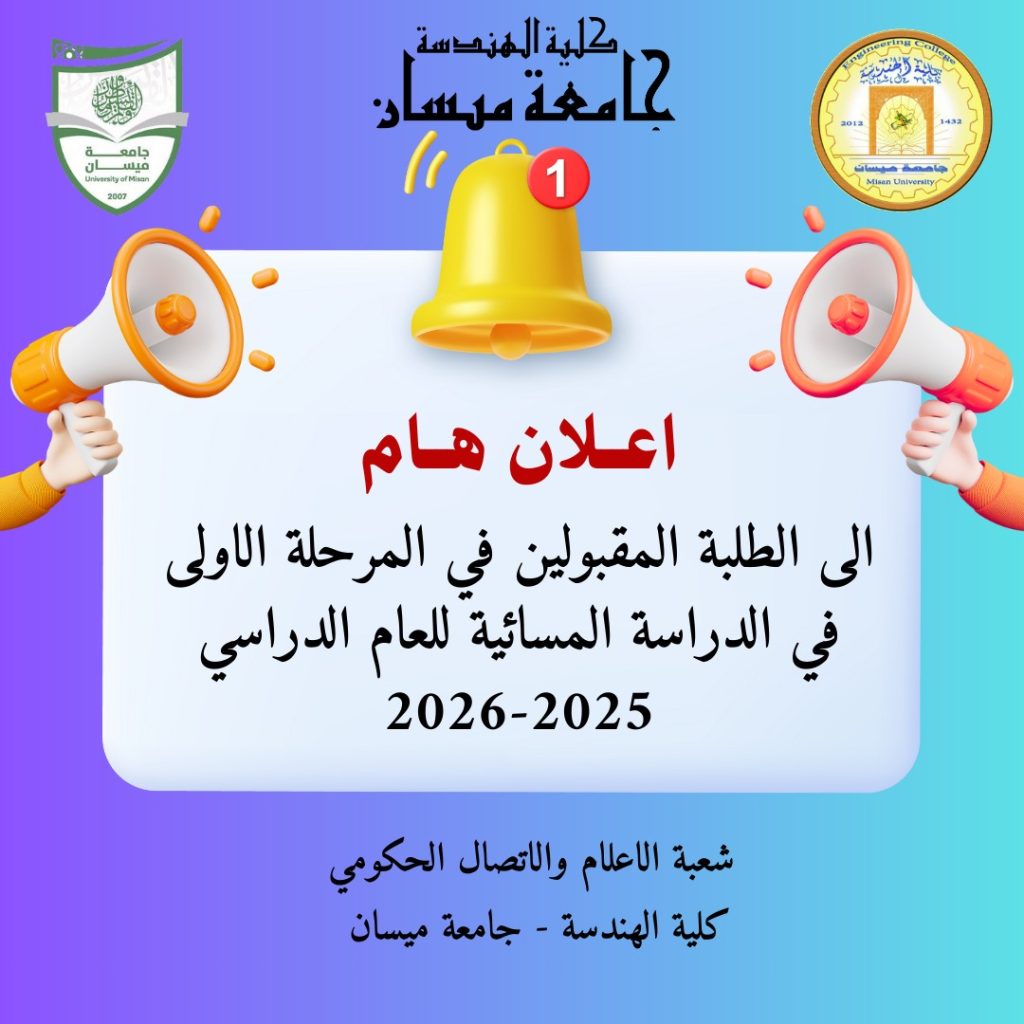 تهيب كلية الهندسة – جامعة ميسان بجميع الطلبة المقبولين في المرحلة الأولى في الدراسة المسائية إلى الالتزام التام بأوقات المحاضرات والحرص على الحضور في الوقت المحدد دون تأخير، فضلًا عن الالتزام بالزي الجامعي الموحد الذي يعكس هوية الطالب وانتماءه المؤسسي. كما تؤكد على ضرورة احترام التعليمات والانضباط الجامعي داخل الحرم الجامعي، بما يعكس صورة حضارية تليق بطلبة كلية الهندسة. إن الالتزام بهذه التعليمات يمثل خطوة أساسية في بناء شخصية الطالب الجامعي وتحقيق النجاح الأكاديمي.