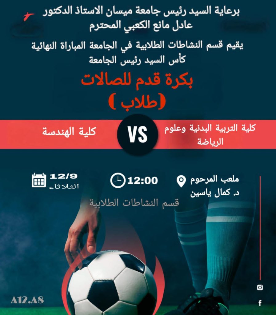 برعاية وإشراف عميد كلية الهندسة الأستاذ الدكتور عباس عوده داود، وبدعم مباشر من شعبة النشاطات الطلابية في الكلية، يواصل منتخب كلية الهندسة للطلاب تألقه في بطولة السيد رئيس جامعة ميسان لخماسي الكرة، والتي ينظّمها قسم النشاطات الطلابية في الجامعة على ملاعب كلية التربية البدنية وعلوم الرياضة.