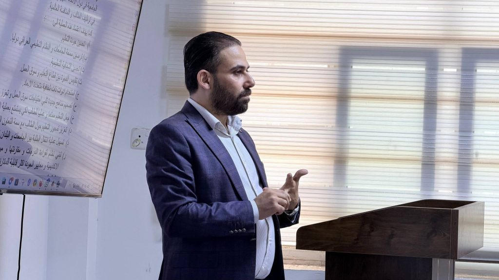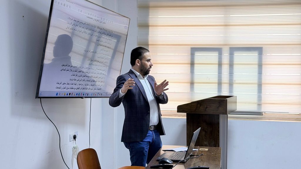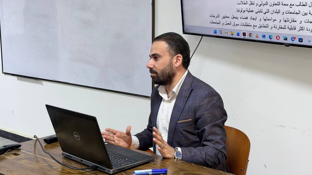 كما استعرض المحاضرون الجوانب التنظيمية والإدارية المتعلقة بتسجيل المقررات، وبيّنوا للطلبة كيفية التعامل مع الجدول الدراسي ومتطلبات النجاح ضمن نظام بولونيا.