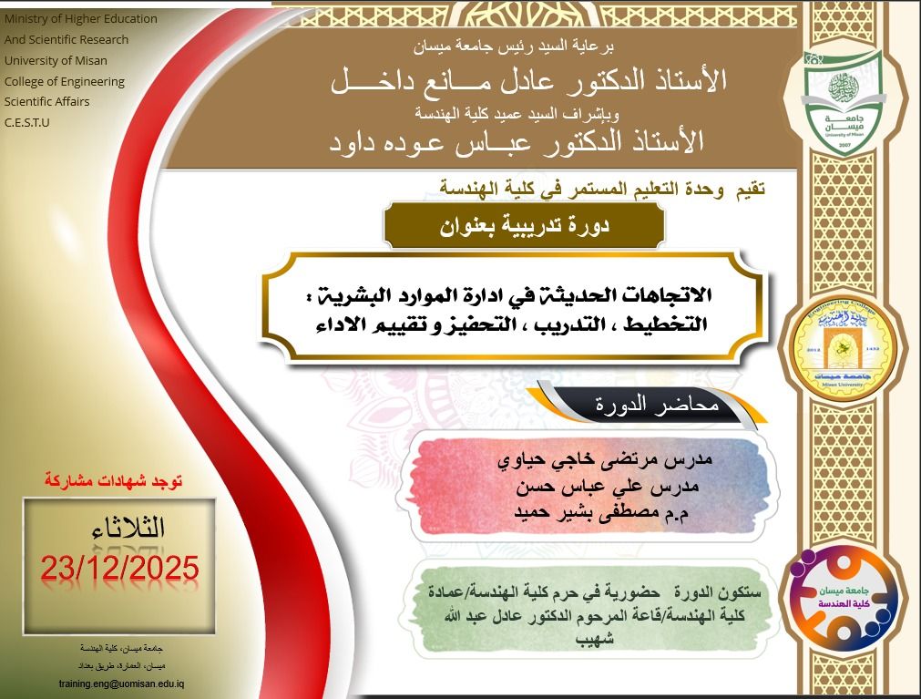 وذلك في يوم الثلاثاء الموافق 23/12/2025، ستنعقد الدورة في حرم كلية الهندسة.