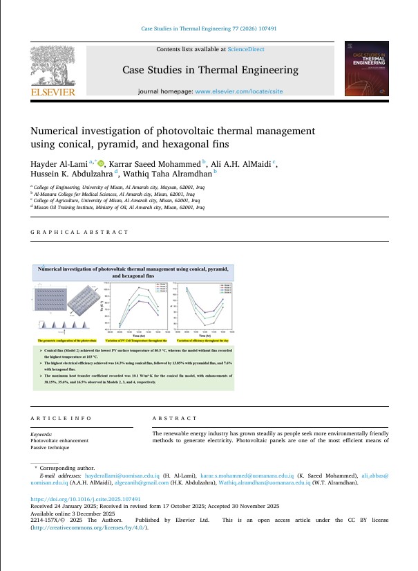 نُشر بحث علمي للمدرس حيدر ناصر مناتي اللامي، التدريسي في قسم الهندسة الكهربائية في كلية الهندسة، مع فريق بحثي من جامعات ومؤسسات عراقية،