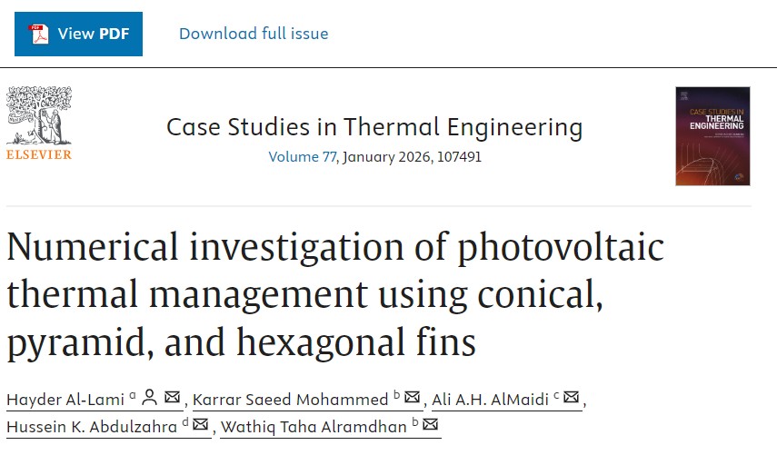 الصادرة عن دار النشر العالمية Elsevier، والتي تُعد من المجلات العلمية الرصينة والمتخصصة في مجال الهندسة الحرارية والطاقة. وتُصنَّف المجلة ضمن الربع الأول (Q1) في قواعد بيانات Scopus، كما أنها مفهرسة في Web of Science، وتتميّز بمؤشرات علمية عالية حيث تمتلك ( ( Impact Factor =6.4 & CiteScore = 10.0، ما يجعل النشر فيها دليلاً على جودة البحث وأهميته العلمية على المستوى الدولي.
