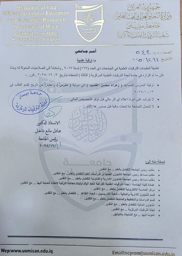تتقدم عمادة وأسرة كلية الهندسة بكادرها التدريسي والوظيفي كافة، بأصدق التهاني والتبريكات إلى التدريسية في قسم الهندسة الكهربائية زهراء محسن اغضيب، بمناسبة صدور الأمر الجامعي بترقيتها العلمية إلى مرتبة (مدرس)، وذلك استنادًا إلى تعليمات الترقيات العلمية المعتمدة في الجامعات العراقية.