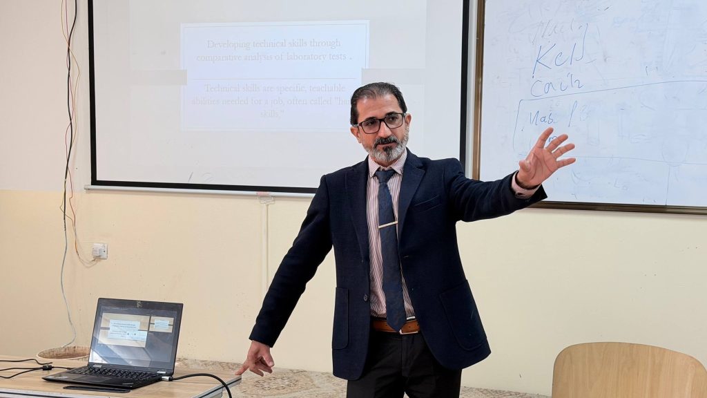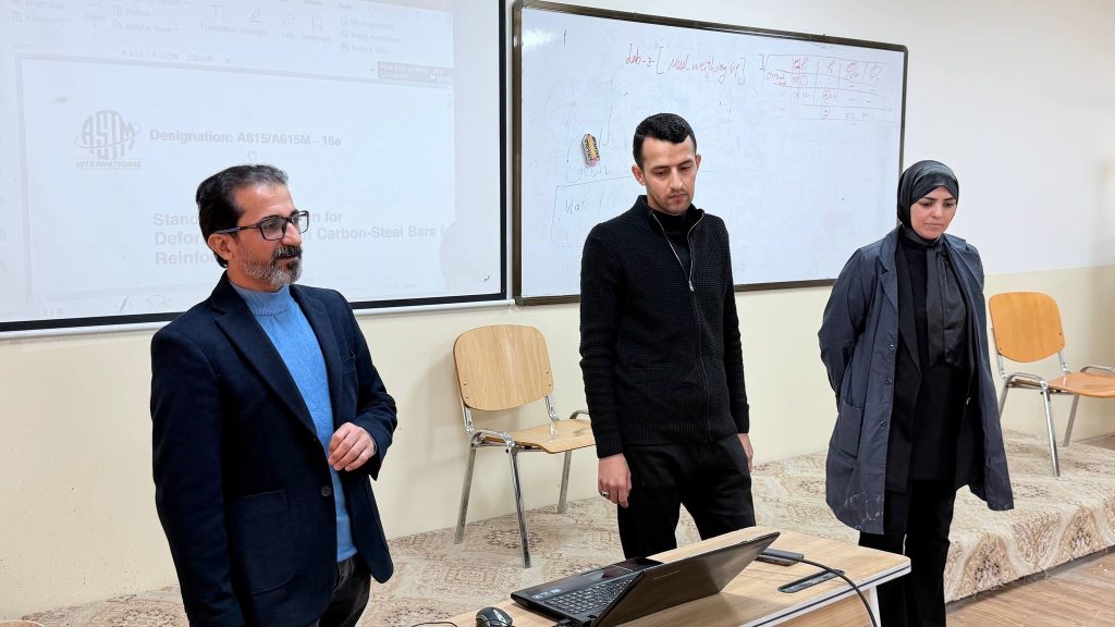 وأُقيمت الدورة في قاعة التدريب والتطوير التابعة للمختبر الإنشائي في كلية الهندسة، وهدفت إلى تطوير مهارات الفحص الهندسي لدى المهندسين والفنيين، من خلال اعتماد أسلوب التحليل المقارن للفحوصات المختبرية، بما يسهم في رفع كفاءة الأداء وضمان الاستمرارية في مسار التطوير والتحسين المستمر، وبما ينسجم مع متطلبات الجودة والمعايير المعتمدة في العمل المختبري.