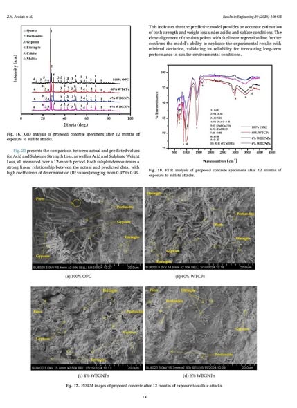 أظهرت النتائج تحسنًا ملحوظًا في متانة الخرسانة، خاصة عند استخدام 4–6٪ من جسيمات السيليكا النانوية، حيث انخفضت خسائر المقاومة والوزن والنفاذية بشكل كبير مقارنة بالخرسانة التقليدية، سواء تحت الهجوم الحمضي أو الكبريتاتي. ويُعزى هذا التحسن إلى تفاعل بوزولاني فعّال أدى إلى تكوين بنية داخلية أكثر كثافة وأقل مسامية، مما حدّ من تشكل الجبس والإترنجيت المسببين لتلف الخرسانة.