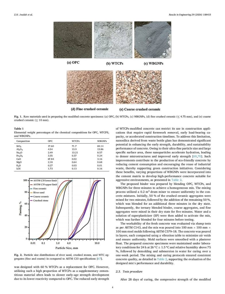 تم تصنيع خرسانة صديقة للبيئة باستبدال الركام الطبيعي بالكامل بركام من مخلفات السيراميك ، مع استبدال 60٪ من الإسمنت البورتلاندي بمسحوق مخلفات السيراميك، وإضافة جسيمات نانوية من السيليكا المستخلصة من زجاج القوارير بنسب مختلفة. جرى تقييم أداء الخرسانة بعد تعريضها لمدة 6 و12 شهرًا لمحاليل حمض الكبريتيك والكبريتات بتركيز 10٪.