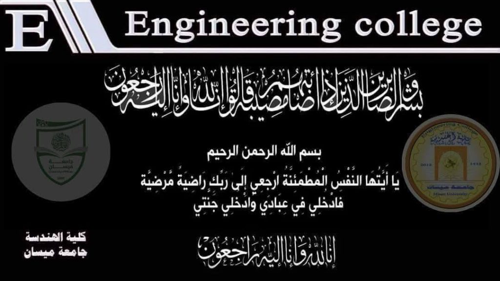 بقلوب مؤمنة بقضاء الله وقدره، وببالغ الحزن والأسى، يتقدم السيد عميد كلية الهندسة وأسرة كلية الهندسة من أعضاء الهيئة التدريسية والكادر الوظيفي في كليتنا بأحر التعازي وصادق المواساة إلى الدكتور (علاء قاسم عطيه) التدربسي في كليتنا، بوفاة المغفور له بإذن الله والده الحاج قاسم عطيه رحمه الله واسكنه فسيح جناته