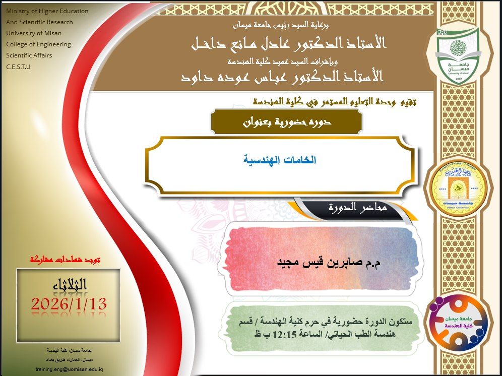 برعاية السيد رئيس جامعة ميسان الأستاذ الدكتور عادل مانع داخل وبإشراف السيد عميد كلية الهندسة الأستاذ الدكتور عباس عوده داود تُقيم وحدة التعليم المستمر في كلية الهندسة، وبالتعاون مع قسم هندسة الطب الحياتي، دورة حضورية بعنوان: