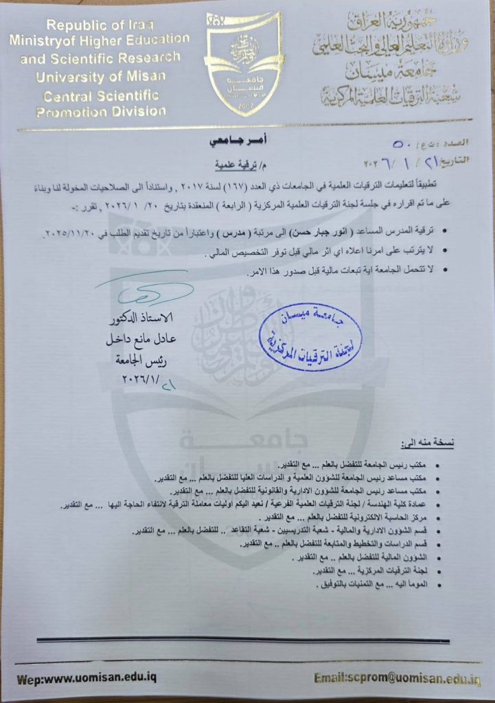 تتقدم عمادة وأسرة كلية الهندسة بكادرها التدريسي والوظيفي كافة، بأصدق التهاني والتبريكات إلى التدريسي في قسم الهندسة الكهربائية انور جبار حسن، بمناسبة صدور الأمر الجامعي بترقيته العلمية إلى مرتبة (مدرس)، وذلك استنادًا إلى تعليمات الترقيات العلمية المعتمدة في الجامعات العراقية.