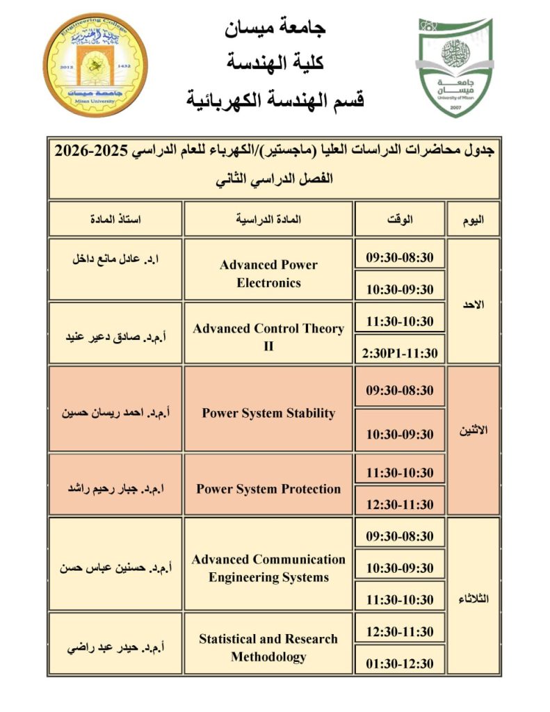 تُعلن كلية الهندسة – قسم الهندسة الكهربائية عن جدول محاضرات الدراسات العليا (الماجستير) للعام الدراسي 2025–2026 / الفصل الدراسي الثاني، والمبيّن في الجدول ادناه.