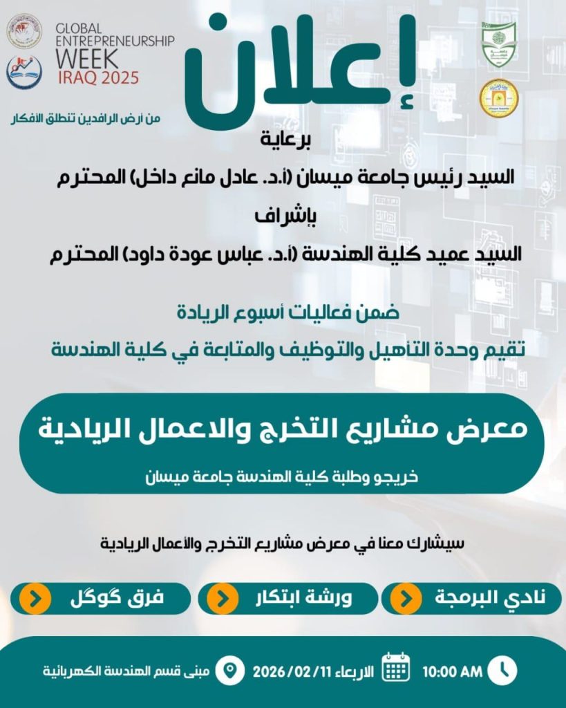 وضمن فعاليات أسبوع الريادة العالمي ستقيم وحدة التأهيل والتوظيف والمتابعة في كلية الهندسة
