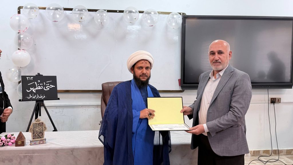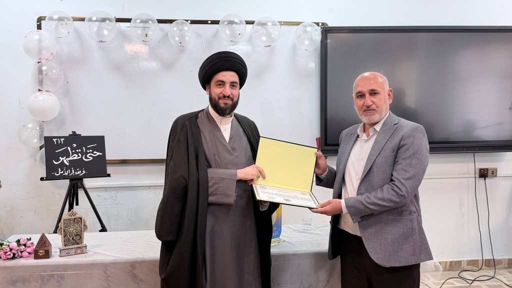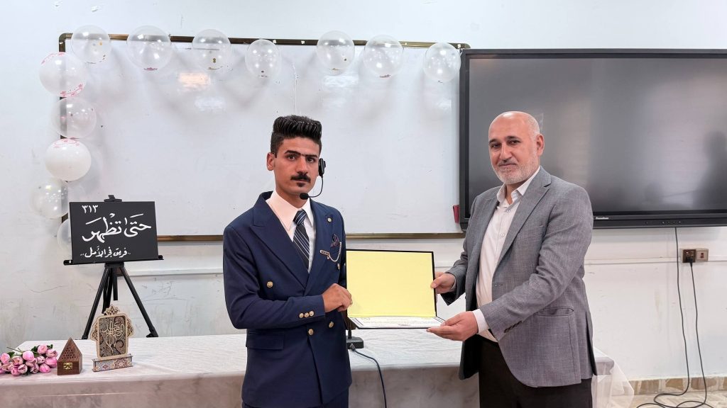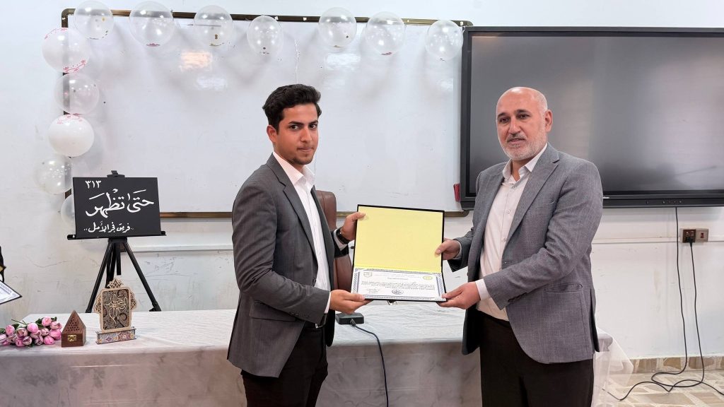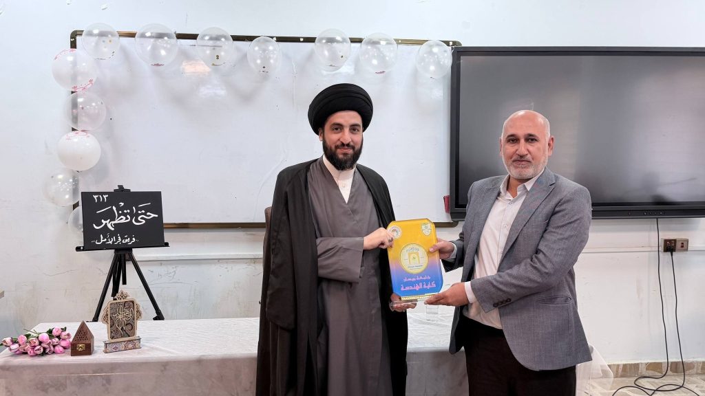 وفي ختام المحفل، قدّم الأستاذ الدكتور سعد فهد رسن درع الكلية وشهادات تقديرية لسماحة السيد الضيف وللسادة المشاركين والقائمين على تنظيم الفعالية، مثمنًا رعاية السيد عميد الكلية ودعمه المتواصل للأنشطة العلمية والثقافية التي تسهم في تعزيز الهوية القيمية لطلبة الكلية وترسيخ روح الانتماء والمسؤولية.