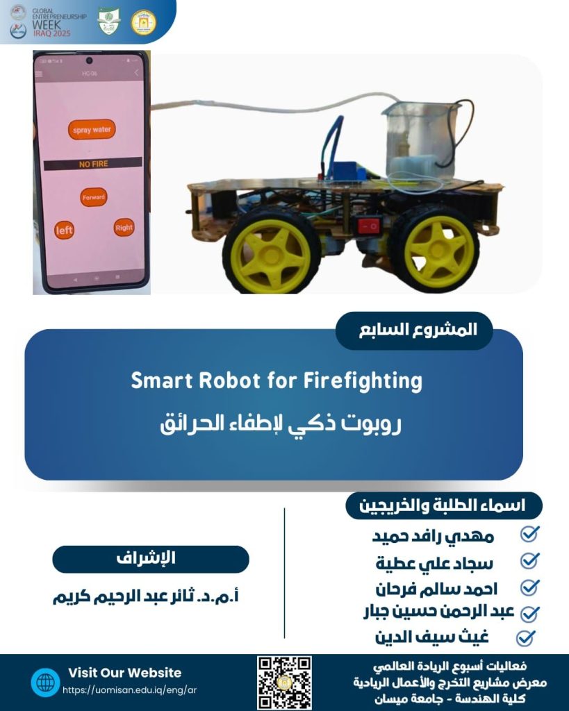 يهدف هذا المشروع إلى تصميم وتنفيذ روبوت ذكي صغير الحجم على هيئة سيارة، قادر على اكتشاف مصادر الحريق وإخمادها تلقائيًا. يعتمد النظام على لوحة تحكم مركزية (Arduino) كوحدة معالجة رئيسية، تتصل بعدد من المكونات الإلكترونية والميكانيكية لتمكين الروبوت من أداء مهمته بكفاءة.