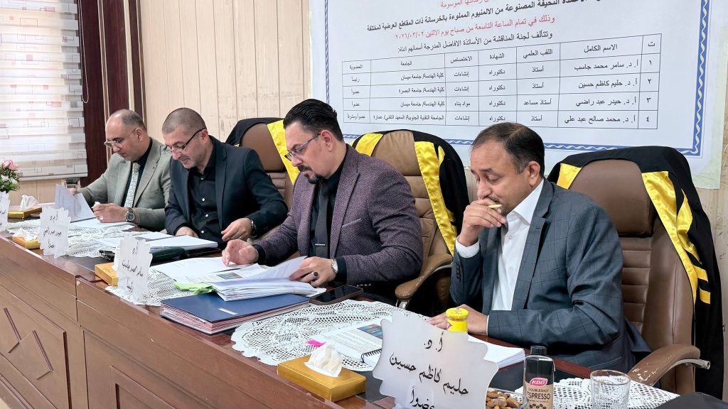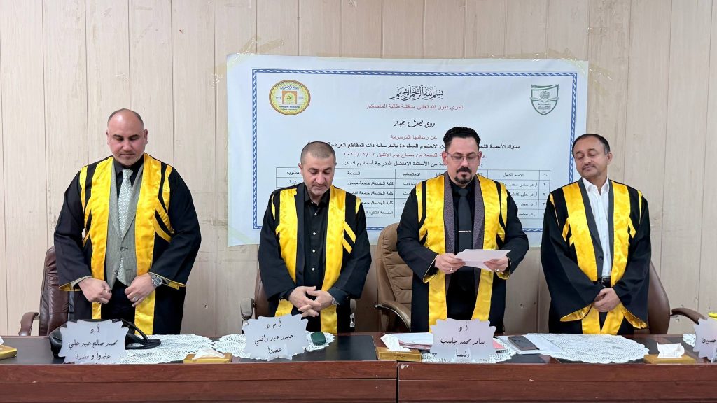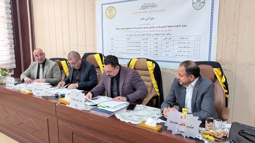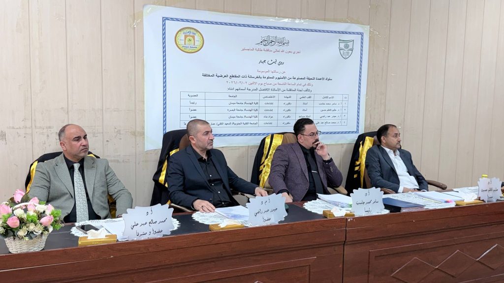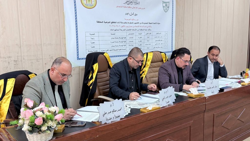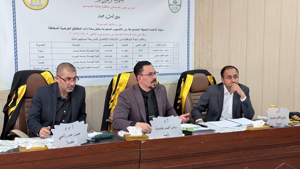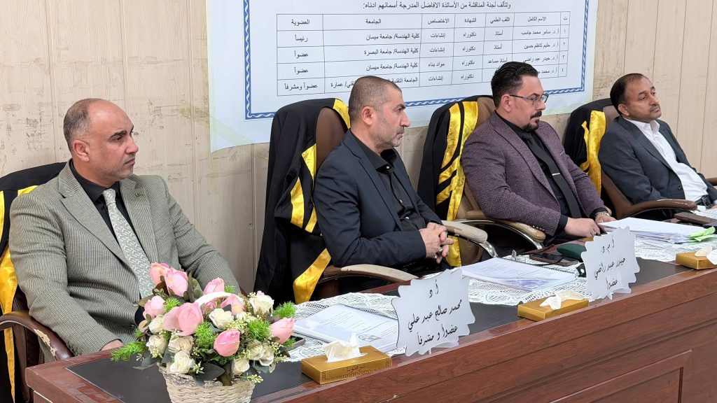 شهد قسم الهندسة المدنية في كلية الهندسة– جامعة ميسان يوم الاثنين الموافق 2/3/2026 مناقشة رسالة الماجستير الموسومة: