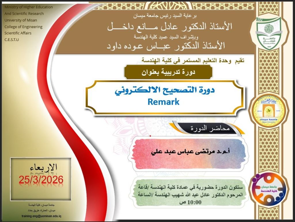 برعاية رئيس جامعة ميسان ألاستاذ الدكتور عادل مانع داخل وباشراف عميد كلية الهندسة ألاستاذ الدكتور عباس عوده داود تقيم وحدة التعليم المستمر في كليتنا بالتعاون مع قسم الهندسة المدنية دورة حضورية بعنوان: