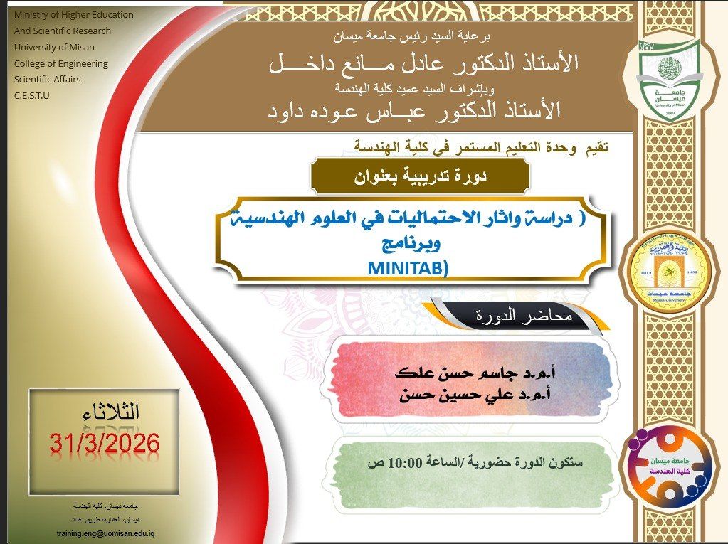 برعاية رئيس جامعة ميسان الاستاذ الدكتور عادل مانع داخل، وباشراف عميد كلية الهندسة الاستاذ الدكتور عباس عوده داود.