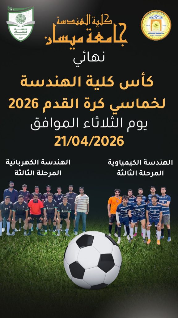 برعاية السيد عميد كلية الهندسة الاستاذ الدكتور عباس عوده داود، وبإشراف شعبة النشاطات الطلابية في الكلية، تُقام يوم غدٍ الثلاثاء الموافق (21/4/2026)، في تمام الساعة 11:00 صباحًا، المباراة النهائية لبطولة خماسي كرة القدم – كلية الهندسة 2026.