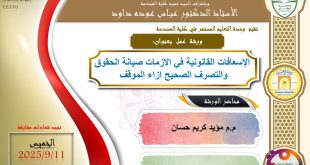 برعاية السيد رئيس جامعة ميسان الأستاذ الدكتور عادل مانع داخل وبإشراف السيد عميد كلية الهندسة الأستاذ الدكتور عباس عودة داود تعلن وحدة التعليم المستمر بالتعاون مع قسم هندسة النفط في كلية الهندسة عن إقامة ورشة حضورية بعنوان: (الإسعافات القانونية في الأزمات: صيانة الحقوق والتصرف الصحيح إزاء الموقف) يحاضر فيها المدرس …
