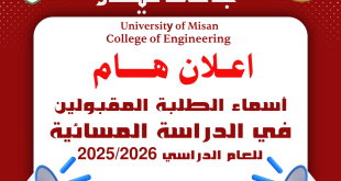 سيتم استقبال الطلبة المقبولين لغرض التسجيل اعتبارا من يوم الاحد الموافق 16/11/2025 ولغاية نهاية الدوام الرسمي ليوم الأربعاء الموافق 19/11/2025 وفي حال تخلف الطلبة المقبولين عن التسجيل سيتم رفع أسماء الطلبة الاحتياط بالتتابع. المستمسكات المطلوبة للتسجيل: وثيقة الدراسة الإعدادية مصدقه من مديرية التربية. استمارة الفحص الطبي. استنساخ هوية الأحوال المدنية …