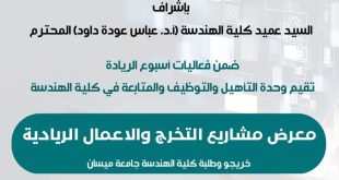 برعايةالسيد رئيس جامعة ميسان (أ.د. عادل مانع داخل) المحترمبإشرافالسيد عميد كلية الهندسة (أ.د. عباس عودة داود) المحترموضمن فعاليات أسبوع الريادة العالمي ستقيم وحدة التأهيل والتوظيف والمتابعة في كلية الهندسةمعرض مشاريع التخرج والأعمال الرياديةسيشارك معنا في معرض مشاريع التخرج والأعمال الريادية:نادي البرمجةورشة ابتكارفرق كوكل المكان: مبنى قسم الهندسة الكهربائية الأربعاء ، …