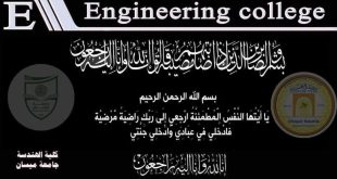 إنا لله وإنا إليه راجعونبقلوب مؤمنة بقضاء الله وقدره، وببالغ الحزن والأسى، يتقدم السيد عميد كلية الهندسة وأسرة كلية الهندسة من أعضاء الهيئة التدريسية والكادر الوظيفي في كليتنا بأحر التعازي وصادق المواساة إلى الدكتور (احمد مالك العنتاكي) التدريسي في كليتنا، بوفاة المغفور له بإذن الله والده المهندس مالك عبد الغني …