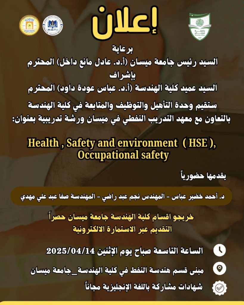 ستقيم وحدة التأهيل والتوظيف والمتابعة في كلية الهندسة وبالتعاون مع معهد التدريب النفطي في ميسان ورشة تدريبية بعنوان: