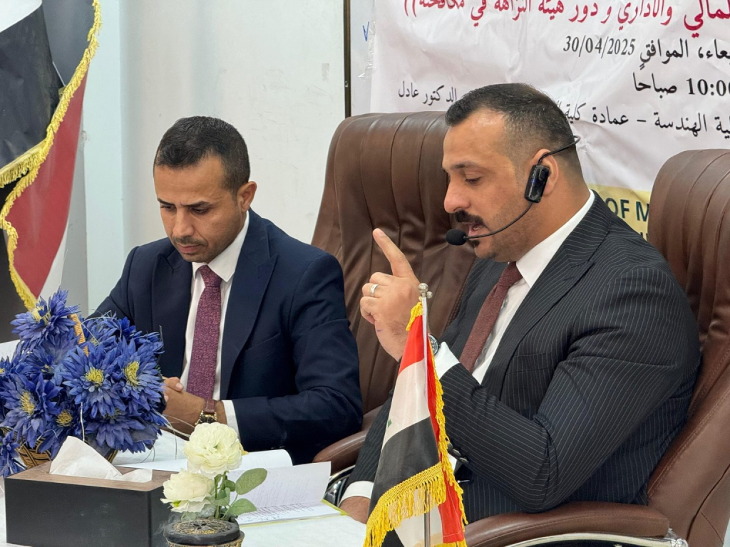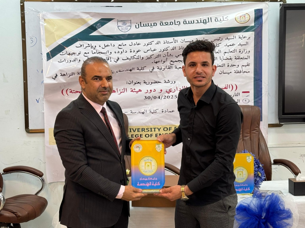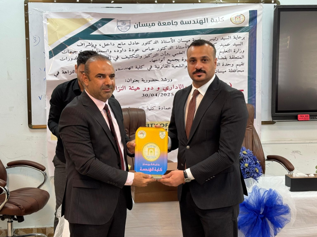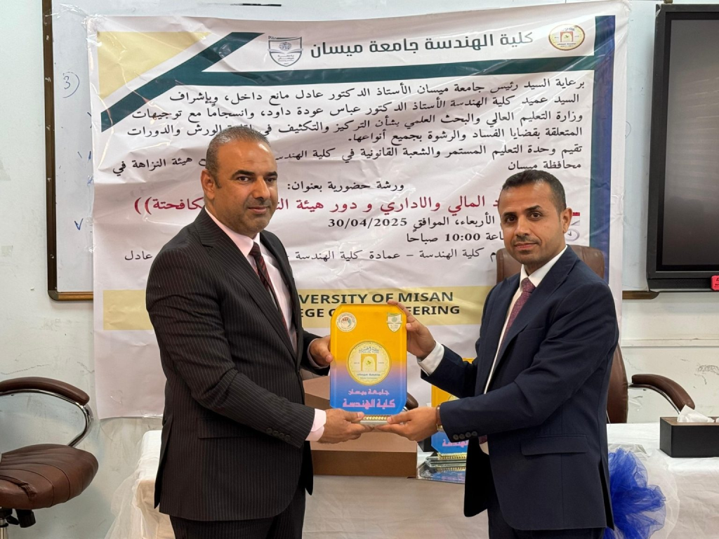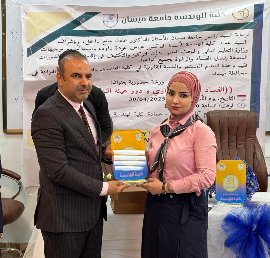 Under the patronage of the President of the University of Maysan, Professor Adel Man’e Dakhel, and under the direct supervision of the Dean of the College of Engineering, Professor Abbas Oda Dawood, the College of Engineering –, represented by the Continuing Education Unit and the Legal Division –, organized an in-person course entitled: “Financial and administrative corruption and the role of the Integrity Commission in combating it”.