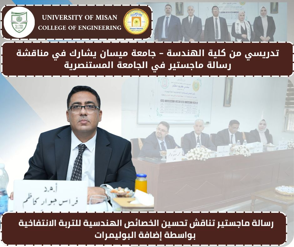 Assistant Professor Firas Jawad Kazem, a lecturer at the faculty of engineering – University of Maysan, participated as a member of the committee discussing the master’s thesis of the student Sondos Karim Mutasher on Wednesday, September 3, 2025, at the faculty of engineering – Al-Mustansiriya University / Department of Civil Engineering.