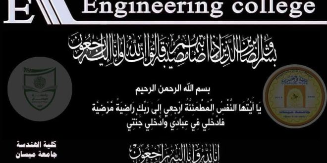 إنا لله وإنا إليه راجعون بقلوب مؤمنة بقضاء الله وقدره، وببالغ الحزن والأسى، يتقدم السيد عميد كلية الهندسة وأسرة كلية الهندسة من أعضاء الهيئة التدريسية والكادر الوظيفي في كليتنا بأحر التعازي وصادق المواساة إلى السيد (خيري عبعوب مهاوي) المنسب للعمل في كليتنا، بوفاة المغفور له بإذن الله والده الحاج عبعوب …