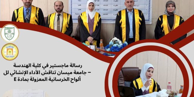 نوقشت في كلية الهندسة – جامعة ميسان رسالة ماجستير للطالبة زينب إبراهيم سعيد، وذلك في قسم الهندسة المدنية، عن رسالتها الموسومة:(الأداء الإنشائي للّوحة الخرسانية عالية المقاومة ذات الاتجاه الواحد والمكوّنة من طبقتين معزولتين بمادة الـ EPS، والمزوّدة بموصلات قص من صناديق فولاذية مثقبة)وجرت المناقشة العلنية بحضور لجنة علمية متخصصة، انتهت …