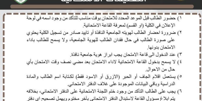 تُهيب كلية الهندسة – جامعة ميسان بجميع طلبتها الأعزاء الالتزام التام بالتعليمات والضوابط الامتحانية المعتمدة، حرصًا على ضمان سير الامتحانات بانسيابية وعدالة، وتوفير أجواء امتحانية مناسبة للجميع.وتتمنى الكلية لطلبتها الأعزاء التوفيق والنجاح الدائم، وتحقيق أفضل النتائج في مسيرتهم العلمية.شعبة الاعلام والاتصال الحكوميكلية الهندسة جامعة ميسان