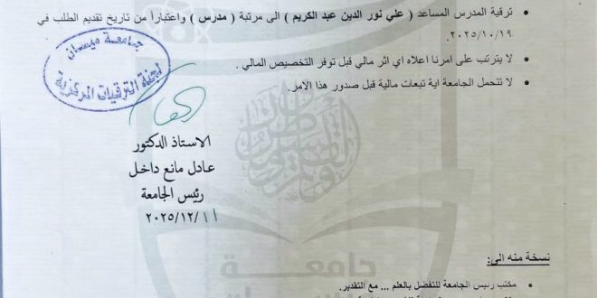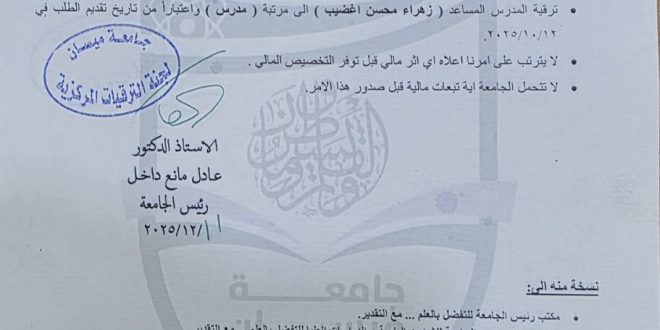 تتقدم عمادة وأسرة كلية الهندسة بكادرها التدريسي والوظيفي كافة، بأصدق التهاني والتبريكات إلى التدريسية في قسم الهندسة الكهربائية زهراء محسن اغضيب، بمناسبة صدور الأمر الجامعي بترقيتها العلمية إلى مرتبة (مدرس)، وذلك استنادًا إلى تعليمات الترقيات العلمية المعتمدة في الجامعات العراقية.وتأتي هذه الترقية تتويجًا لجهودها العلمية والأكاديمية المتميزة، وما قدّمته من …