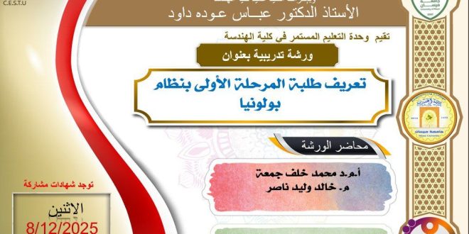 برعاية السيد رئيس جامعة ميسان الاستاذ الدكتور عادل مانع داخل، وباشراف السيد عميد كلية الهندسة الاستاذ الدكتور عباس عوده داود.تقيم وحدة التعليم المستمر في كلية الهندسة، بالتعاون مع قسم الهندسة الكهربائية، ورشة حضورية بعنوان:( تعريف طلبة المرحلة الاولى بنظام بولونيا)والتي سيحاضر فيها:– الاستاذ المساعد الدكتور محمد خلف جمعة– المدرس خالد …