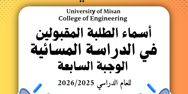 تعلن كلية الهندسة جامعة ميسان عن أسماء الطلبة المقبولين للدراسة المسائية الوجبة السابعة في كلية الهندسة للعام الدراسي 2025-2026.سيتم استقبال الطلبة المقبولين لغرض التسجيل اعتبارا من يوم الاثنين الموافق 15/12/2025 ولغاية نهاية الدوام الرسمي ليوم الثلاثاء الموافق 16/12/2025 وفي حال تخلف الطلبة المقبولين (المذكورة أسمائهم في القوائم المرفقة) يسقط حقهم …