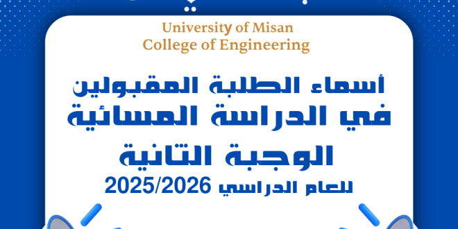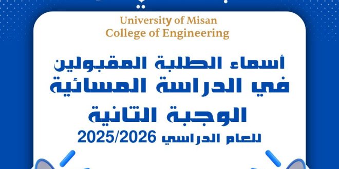تنفيذا لتوجيهات وزارة التعليم العالي والبحث العلمي كلية الهندسة تفتح باب التقديم إلى الدراسة المسائية للعام الدراسي 2025–2026 بنسبة 100% من الخطة لاستيعاب طلبة الدور الثالث • كما سيتم استكمال المقاعد الشاغرة من خلال قبول الطلبة من خريجي الدور الأول والثاني وخريجي السنوات السابقة بجميع فروعها وتخصصاتها ضمن الضوابط المعتمدة …