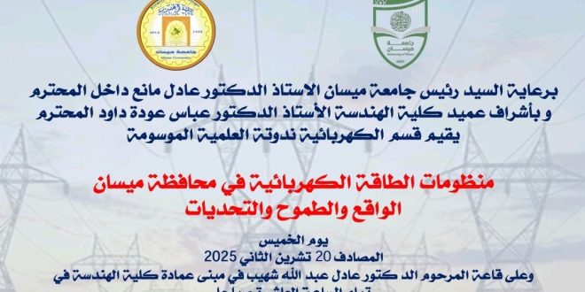 برعاية السيد رئيس جامعة ميسان الأستاذ الدكتور عادل مانع داخل وبإشراف السيد عميد كلية الهندسة الأستاذ الدكتور عباس عوده داوديقيم قسم الهندسة الكهربائية – كلية الهندسة / جامعة ميسانالندوة العلمية الموسومة:((منظومات الطاقة الكهربائية في محافظة ميسان، الواقع والطموح والتحديات))وذلك يوم الخميس الموافق 20 تشرين الثاني 2025، على قاعة المرحوم الدكتور …