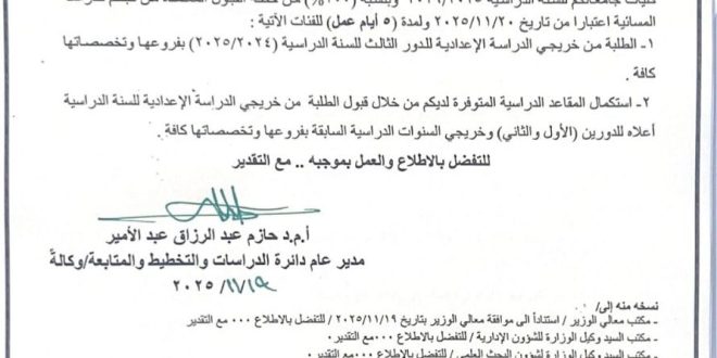 سيتم استقبال الطلبة المقبولين لغرض التسجيل اعتبارا من يوم الاحد الموافق 23/11/2025 ولغاية نهاية الدوام الرسمي ليوم الاثنين الموافق 24/11/2025 وفي حال تخلف الطلبة المقبولين (المذكورة أسمائهم في القوائم المرفقة) عن التسجيل سيتم رفع أسماء بقية الطلبة الاحتياط بالتتابع. المستمسكات المطلوبة للتسجيل: وثيقة الدراسة الإعدادية مصدقه من مديرية التربية. استمارة …