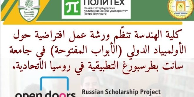 في إطار اهتمام جامعة ميسان بتعزيز التعاون الأكاديمي الدولي وتوفير فرص دراسية عالمية لطلبتها، نظّمت كلية الهندسة صباح يوم الأربعاء الموافق 5 تشرين الثاني 2025 ورشة عمل افتراضية عبر منصة (FCC) بعنوان: (آلية التقديم على المنح الدراسية الروسية ضمن برنامج الأولمبياد الدولي – الأبواب المفتوحة) هدفت الورشة إلى التعريف بآلية …