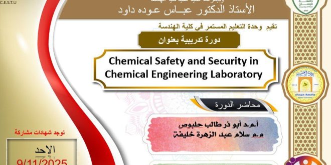 برعاية رئيس جامعة ميسان الاستاذ الدكتور عادل مانع داخل، وبإشراف عميد كلية الهندسة الاستاذ الدكتور عباس عوده داود.تقيم وحدة التعليم المستمر في كلية الهندسة، بالتعاون مع قسم الهندسة الكيمياوية، دورة حضورية بعنوا (Chemical safety and security in chemical engineering laboratory) والتي سيحاضر فيها:– أ.م.د ابو ذر طالب حلبوص– م.م سلام …