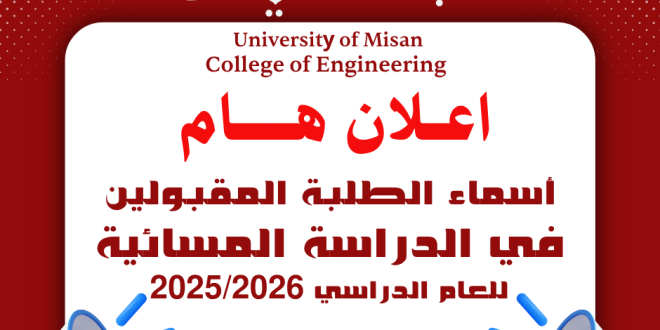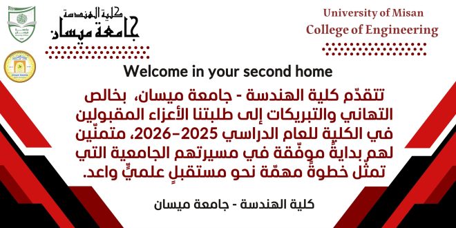 تتقدّم كلية الهندسة بجامعة ميسان بخالص التهاني والتبريكات إلى طلبتنا الأعزاء المقبولين في الكلية للعام الدراسي 2025–2026، متمنّين لهم بدايةً موفّقة في مسيرتهم الجامعية التي تمثّل خطوةً مهمّة نحو مستقبلٍ علميٍّ واعد.إنّ كلية الهندسة إذ تفتح أبوابها أمامكم، تؤكد التزامها بتوفير بيئةٍ أكاديميةٍ متميّزة، تجمع بين التفوق العلمي، والابتكار، وروح …