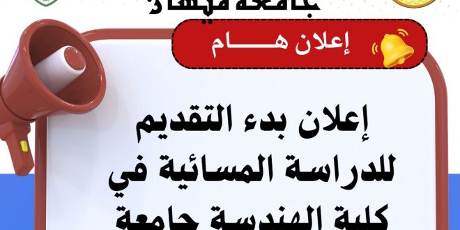 تعلن كلية الهندسة – جامعة ميسان عن فتح باب التقديم للدراسة المسائية (في قسمي هندسة النفط والهندسة الكهربائية) للعام الدراسي 2025/2026، ويكون القبول وفق ضوابط وزارة التعليم العالي والبحث العلمي والطاقة الاستيعابية للأقسام، ابتداءً من يوم الخميس 2/10/2025، علماً أن التقديم مخصص لخريجي الفرع العلمي حصراً في الوقت الحالي. الحد …