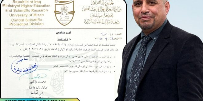 تتقدّم عمادة كلية الهندسة – جامعة ميسان بأحرّ التهاني وأطيب التبريكات إلى الدكتور علي حسين حسن بمناسبة ترقيته العلمية إلى مرتبة أستاذ مساعد في الهندسة الميكانيكية/ مواد. تأتي هذه الترقية تتويجًا لمسيرة علمية حافلة بالعطاء، وجهودٍ متميزة في ميادين البحث والتدريس وخدمة المجتمع الأكاديمي. سائلين المولى عزّ وجل أن يوفقه …