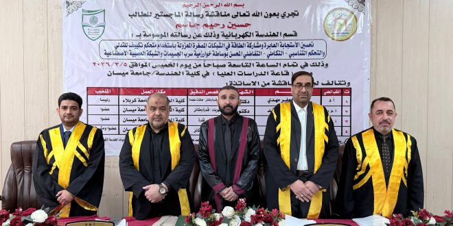 نوقشت في كلية الهندسة- جامعة ميسان رسالة ماجستير للباحث حسين رحيم جاسم، وذلك في قسم الهندسة الكهربائية، عن رسالته الموسومة:(تحسين الاستجابة العابرة ومشاركة الطاقة في الشبكات الدقيقة المعزولة باستخدام متحكم تكيفي للتتبع والتحكم التناسبي–التكاملي–التفاضلي المحسّن بواسطة خوارزمية سرب الجسيمات والشبكة العصبية الاصطناعية)وجرت المناقشة العلنية بحضور لجنة علمية متخصصة، تألفت من …