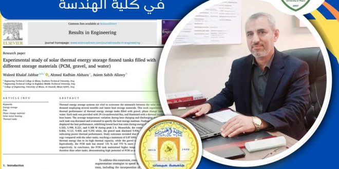 نشر الأستاذ الدكتور أحمد كاظم الشرع، التدريسي في كلية الهندسة، بحثًا علميًا بعنوان: [Experimental study of solar thermal energy storage finned tanks filled with different storage materials (PCM, gravel, and water)] في مجلة Results in Engineering الصادرة عن دار النشر العالمية Elsevier. تُعد هذه المجلة من المجلات الرصينة في مجال …