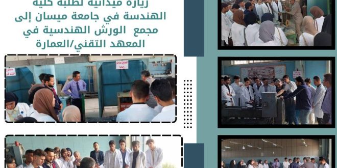 ضمن إطار التعاون العلمي بين مؤسسات وزارة التعليم العالي والبحث العلمي، وحرصاً على تعزيز الجانب العملي لدى الطلبة، نظّم قسم الهندسة الميكانيكية في كلية الهندسة – جامعة ميسان، زيارة ميدانية في إلى الورش الهندسية في المعهد التقني/العمارة، لطلبة المرحلة الأولى. وقد رافق الطلبة في هذه الزيارة كل من:الأستاذ المساعد الدكتور …