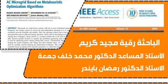 نشر فريق بحثي من كلية الهندسة بحثًا علميًا بعنوان (Optimal Performance of PI Controller for AC Microgrid Based on Metaheuristic Optimization Algorithms) في مجلة IEEE Access، وهي واحدة من المجلات العلمية المرموقة المصنفة ضمن مستوعبات Scopus في الربع الاول (Q1) و Clarivate، والتي تُعنى بنشر الأبحاث الرائدة في مختلف مجالات …