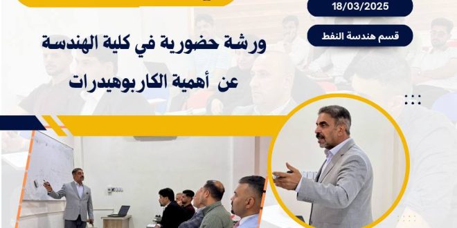 برعاية السيد رئيس جامعة ميسان، الاستاذ الدكتور عادل مانع داخل، واشراف السيد عميد كلية الهندسة الاستاذ الدكتور عباس عودة داود ،نظّم قسم هندسة النفط بالتعاون مع وحدة التعليم المستمر، ورشة عمل حضورية بعنوان (أهمية الهيدروكربونات)، قدّمها الأستاذ المساعد الدكتور حنون حسن مشكور، بحضور نخبة من الكادر التدريسي لقسمي هندسة النفط …