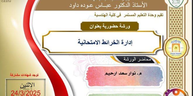 برعاية السيد رئيس جامعة ميسان الأستاذ الدكتور عادل مانع داخل، وبإشراف السيد عميد كلية الهندسة الأستاذ الدكتور عباس عودة داود، تقيم وحدة التعليم المستمر في كلية الهندسة، بالتعاون مع قسم الهندسة الكهربائية، ورشة عمل حضورية بعنوان: (إدارة الخرائط الامتحانية) يُحاضر في الورشة المدرس نوار سعد أرحيم، التدريسي في قسم الهندسة …